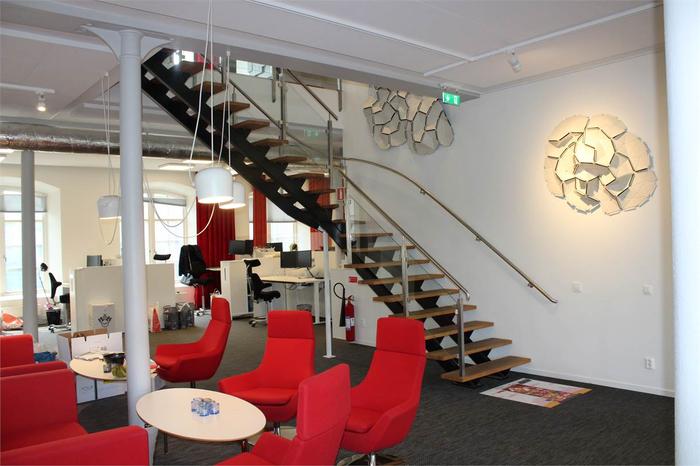 Planlösning:Stor kontorslokal i två plan med internt, öppen och bred trappa. Första planet är stort och öppet medans det andra i dagsläget är kontorsindelat.