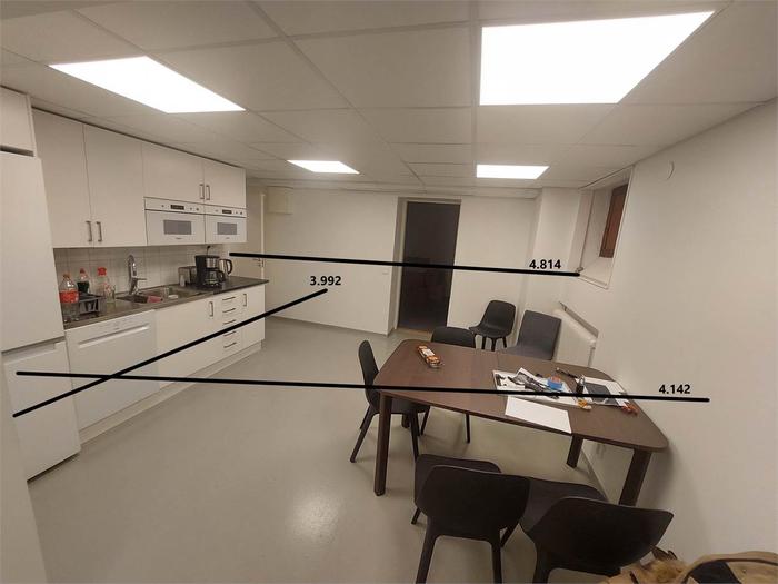 Planlösning:Ett stort och öppet rum med lite avgränsade väggar men ändå öppet. Stort kök som del i det stora rummet.