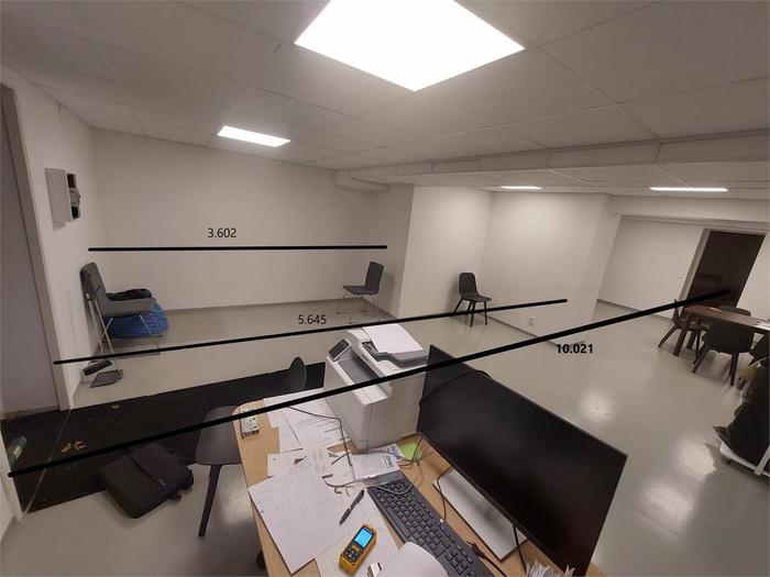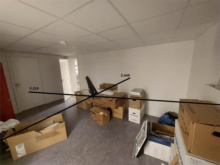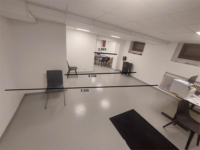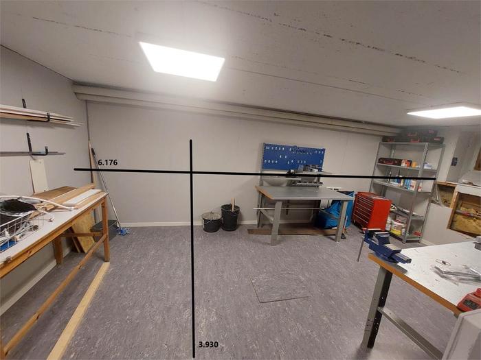 Ett förrådsrum och en verkstad eller avskilt kontor finns längst in i lokalen.