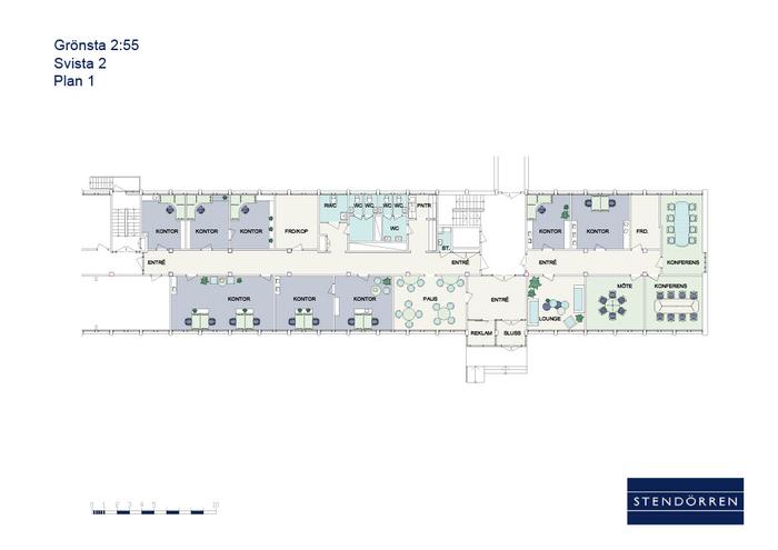 Idag är kontoren mestadels rumsindelade och det finns kyla i varje rum. Konferensdelarna med stort ljusinsläpp. Möjlighet att anpassa lokalerna efter verksamhet.