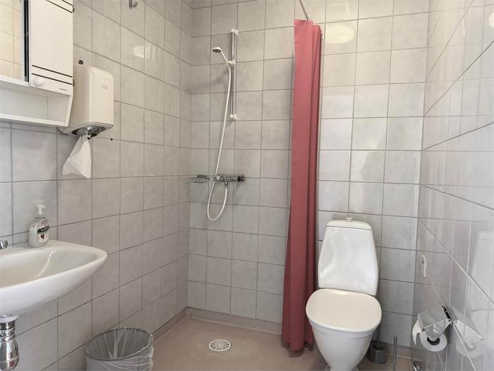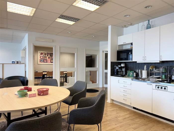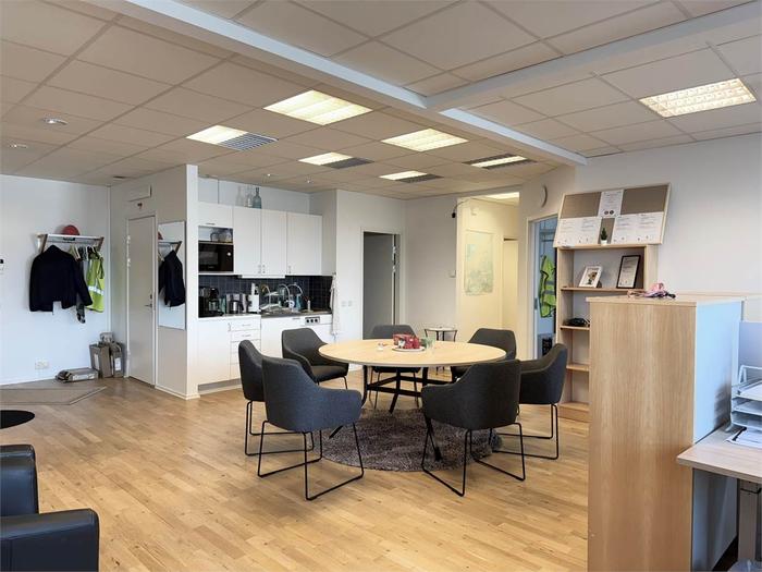 Planlösning:Öppen kontorsyta med ett separat kontor och ett mötesrum, pentry, förråd samt wc med dusch.