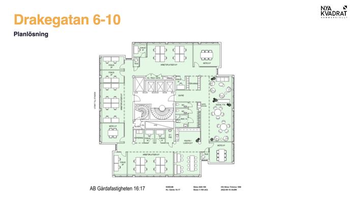 Man når kontoret via husets mysiga entrévåning där det finns bar, restauranger, eldstad och pingisbord. Fredagens After Work finns i huset så man knappt lämna byggnaden. Det finns också möjlighet att hyra halva lokalen med en flexibelt avtalsperiod.