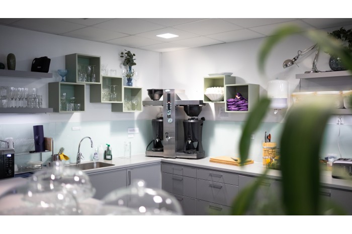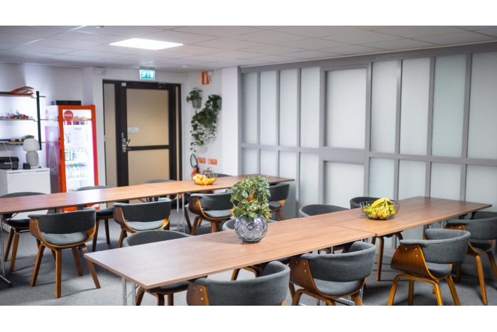 Alla kontorsrum är utrustade med glasväggar och eleganta gardiner. Den stilrena heltäckningsmattan bidrar till en behaglig akustik och tyst arbetsmiljö. I mitten av lokalen finns ett öppet kontorslandskap, avgränsat av gardiner för ökad integritet. Samtliga mötesrum är välutrustade med whiteboard, skärmar och teknisk utrustning. Det finns också flera naturliga mötesplatser där du kan njuta av måltider, kaffe och sociala stunder med kollegor.