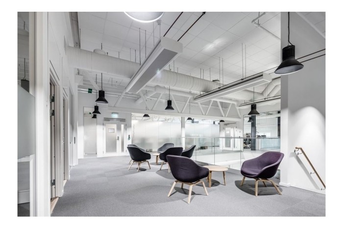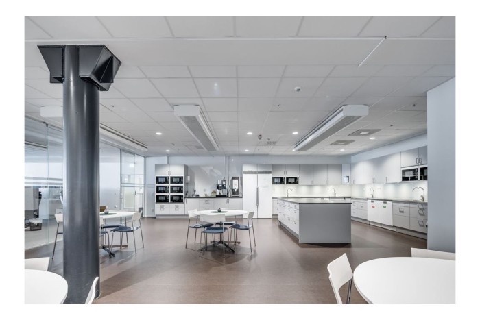 Öppen och ljus planlösning, med bra placering av konferensrum och tysta rum. Direkt access till garaget genom fastigheten samt möjlighet att köra i bil för showroom och utvecklingslab.