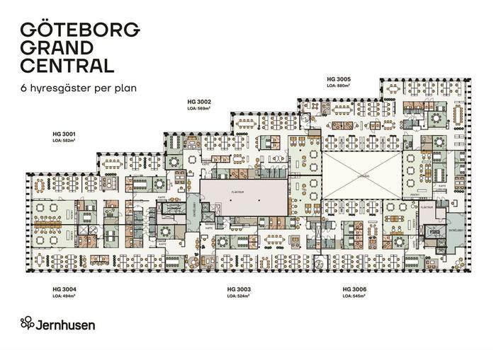 Planlösning:Husets form och funktion ger unik karaktär även för kontoren. Här får man utblickar ner mot stationshallens liv och rörelse, eller ut mot den framväxande staden. Högt i tak, stora fönster och med en tydlig karaktär som är både tidlös och respektfull. Genom långsiktigt hållbar kvalitet i material och funktion vill vi attrahera företag som liksom vi uppskattar Hållbarhet över tid.