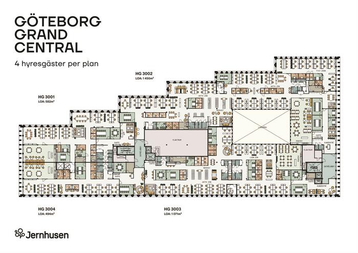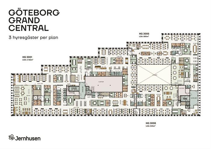 Planlösning:Husets form och funktion ger unik karaktär även för kontoren. Här får man utblickar ner mot stationshallens liv och rörelse, eller ut mot den framväxande staden. Högt i tak, stora fönster och med en tydlig karaktär som är både tidlös och respektfull. Genom långsiktigt hållbar kvalitet i material och funktion vill vi attrahera företag som liksom vi uppskattar Hållbarhet över tid.