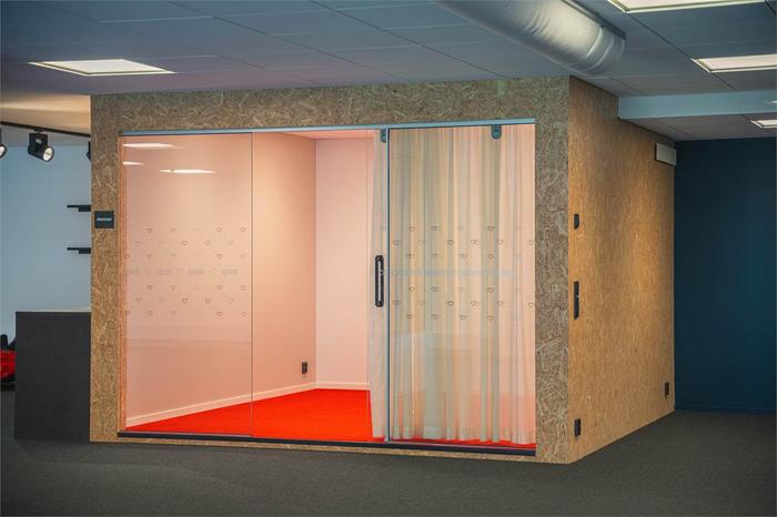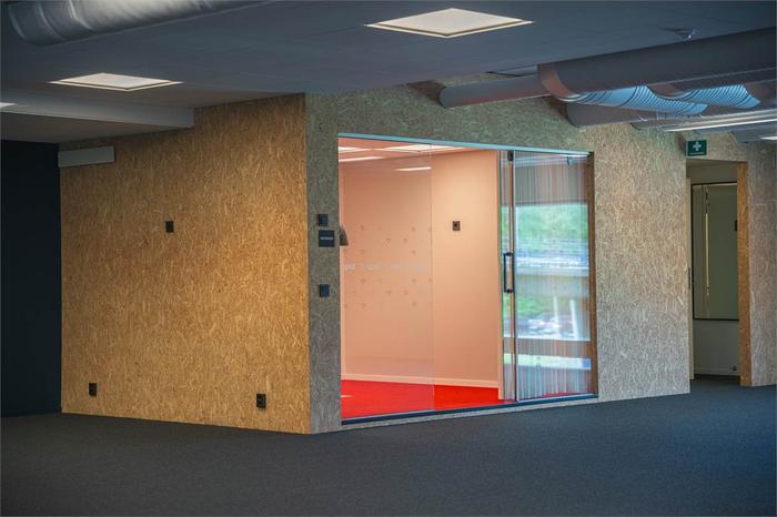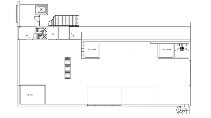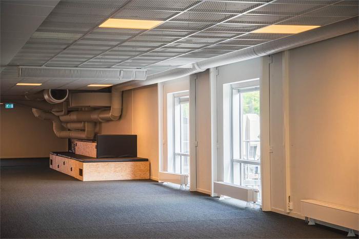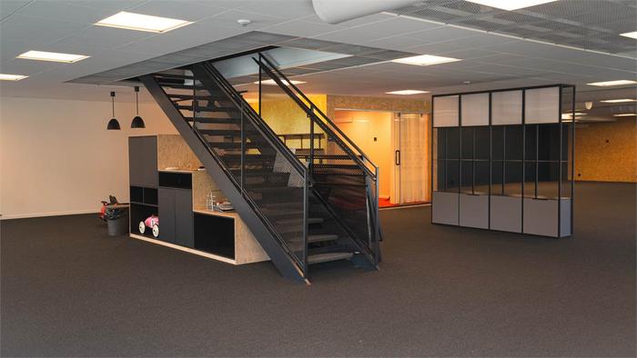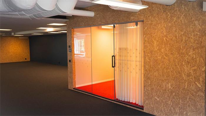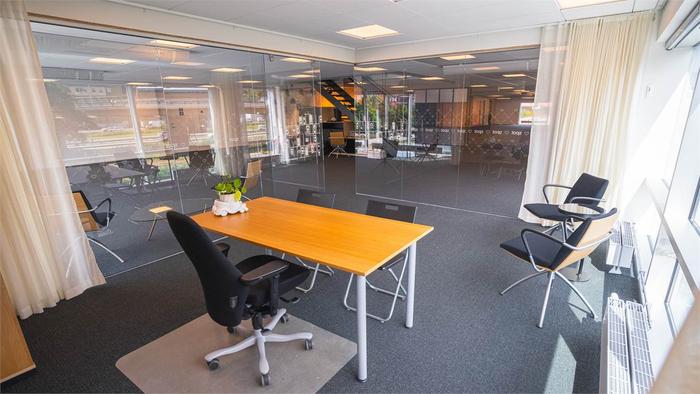 Väldigt öppen planlösning med två mindre mötes/telefonrum och ett inglasat kontor i ena hörnet av lokalen.