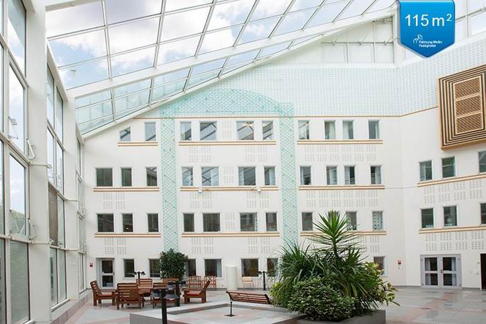 Ytan som ligger en trappa upp i byggnaden gränsar till fastighetens gemensamma ljusgård som går att använda till fikapauser, utställningar och events för hyresgästerna.