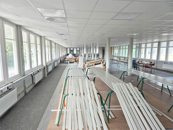 Ytskikten bidrar till en trivsam arbetsmiljö med ljuddämpande textilmattor samt akustikundertak. Belysningen består av dimbara led-plattor.