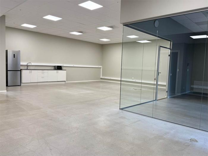 Här får du en öppen planlösning med ett stort kontorsrum och ett pentry, vilket skapar en flexibel och trivsam arbetsmiljö.