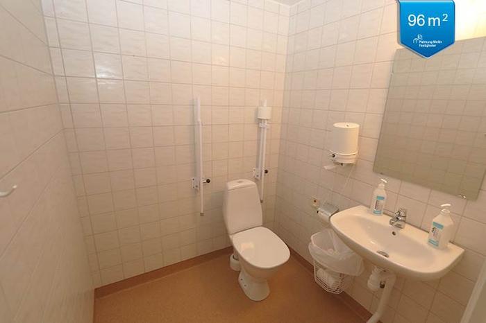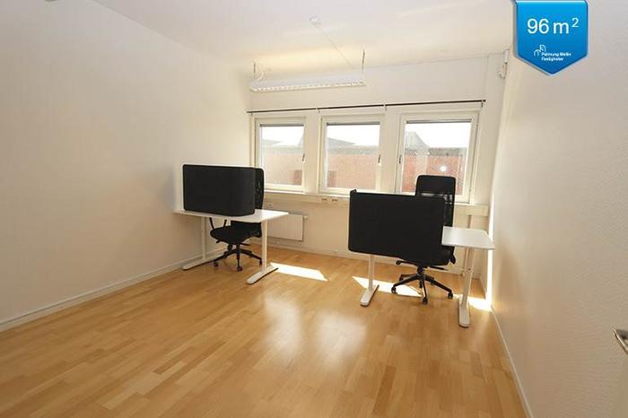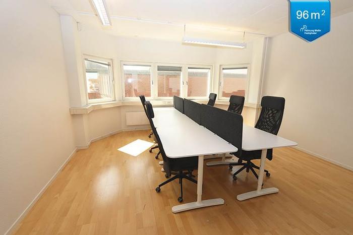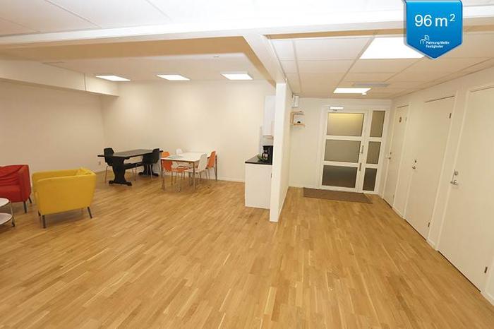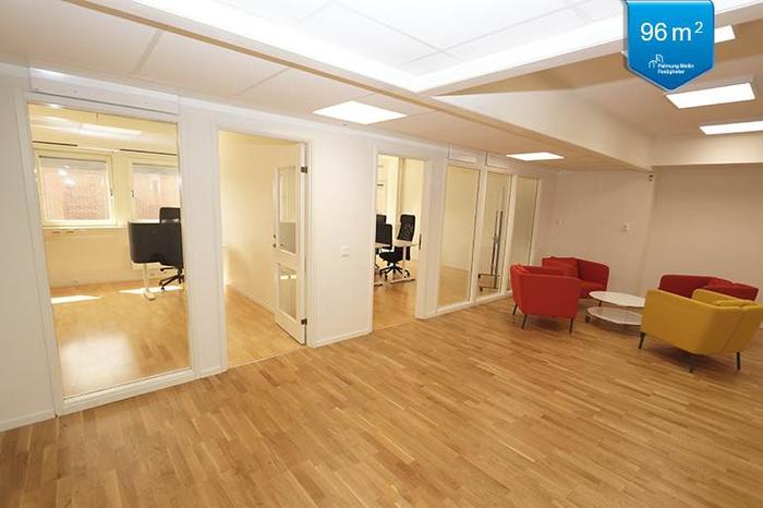 Trevlig och väldisponerad kontorslokal på 96 kvm en trappa upp i byggnaden som även har hiss. Lokalen har egen ingång, två WC, dusch, förråd samt kök, en öppen personalyta och två väl tilltagna kontorsrum som ger flexibilitet när det gäller antalet arbetsplatser.