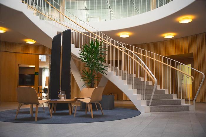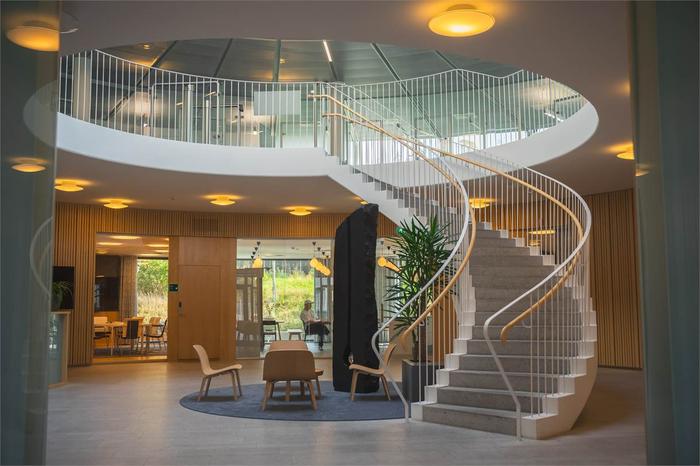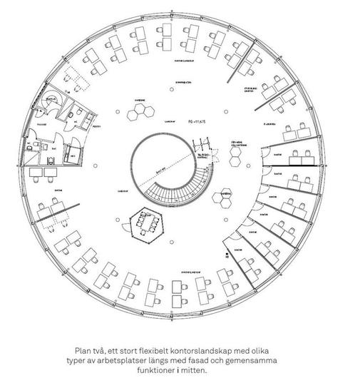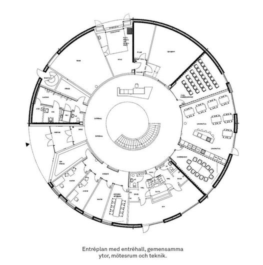 Rund byggnad med generös takhöjd och bra ljusinsläpp.
