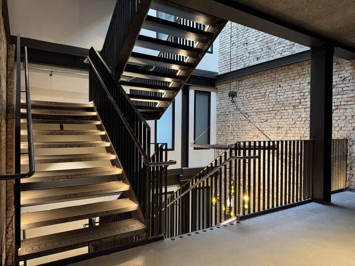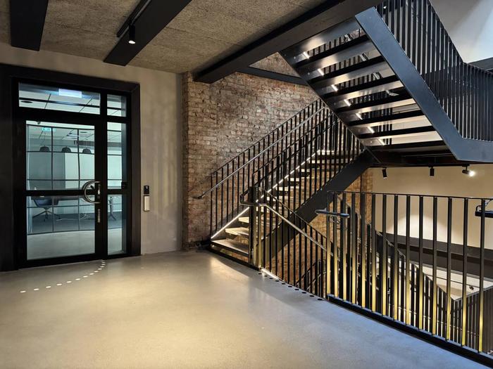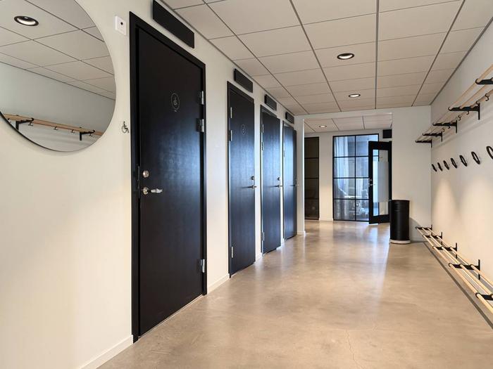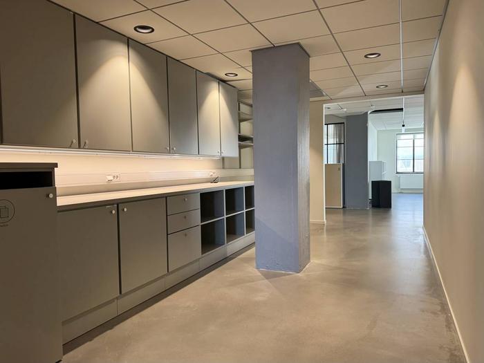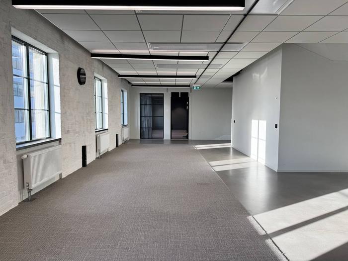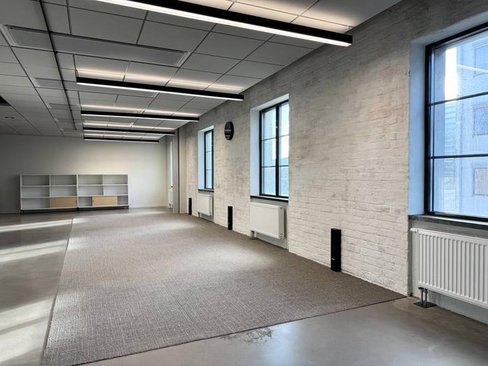 Interiören präglas av en stilren industriell känsla med synliga betong- och tegelväggar, ljudabsorberande textilmattor och modern belysning. Stora fönsterpartier ger ett fint dagsljus och skapar en ljus och trivsam atmosfär genom hela lokalen. Lokalen saknar kök i dagsläget och ett nytt kök uppförs i samband med inflytt, där tillträdande hyresgäst ges möjlighet att påverka både utformning och funktion. Detta skapar goda förutsättningar för en lösning som matchar verksamhetens behov och arbetssätt.