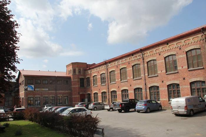 Kontor på andra våningen i stora fabriken, med gott om parkeringsplatser alldeles utanför entrén.