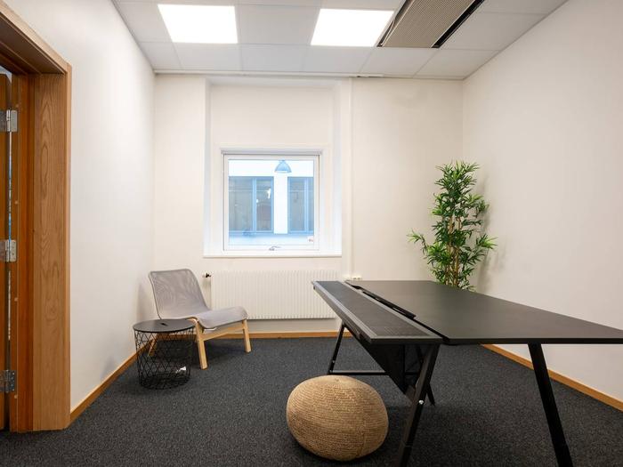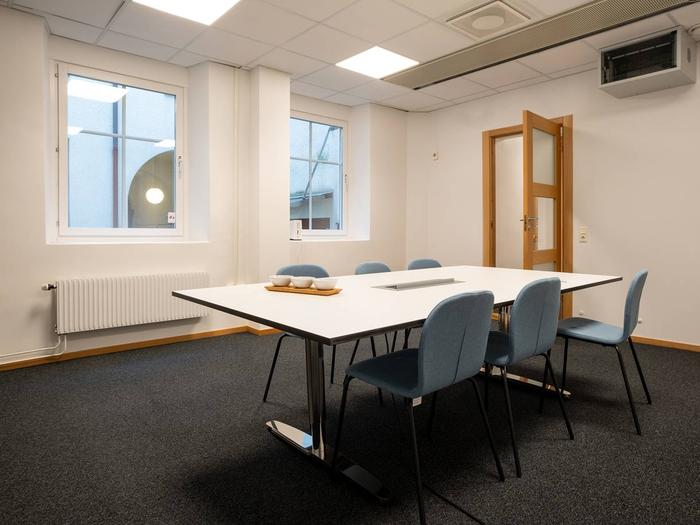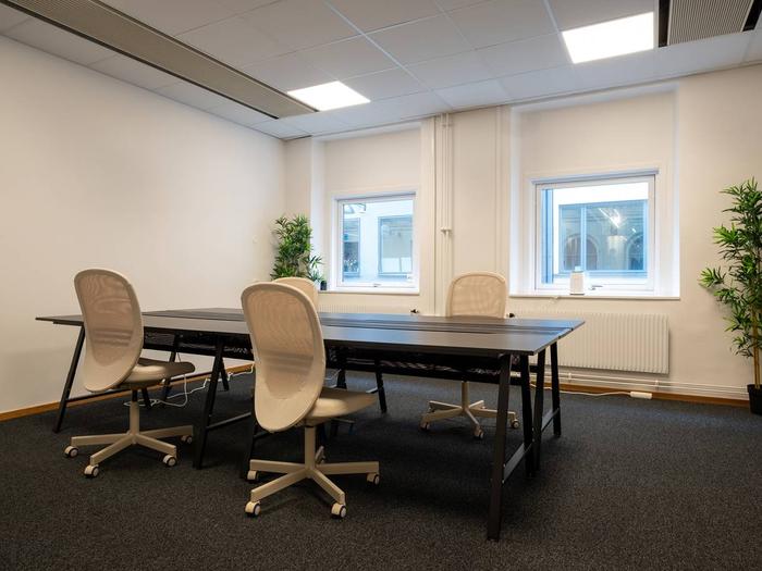 Planlösning:Två större arbetsrum, konferensrum, pentry samt wc med dusch.