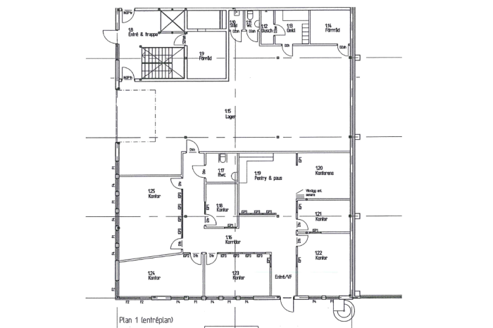På plan 1 finns det fler kontor, konferensrum, lunch- och pausrum, omklädningsrum med dusch och en större öppen kontorsyta.
