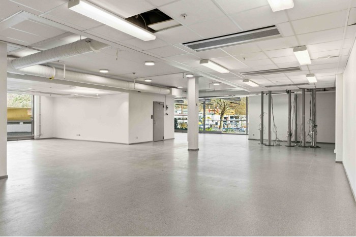 Öppen planlösning på entresolplan. Både planlösning och ytskikt anpassas efter nya hyresgästens önskemål.