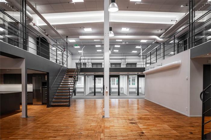 Lokalen har en planlösning med entresolplan i mitten. De varierande ytorna gör det möjligt att kombinera stora öppna arbetsytor, kontor, mötesrum och sociala zoner, perfekt för företag som vill skapa något eget och särskilja sig.