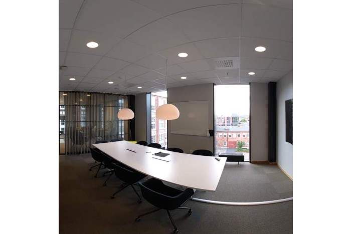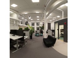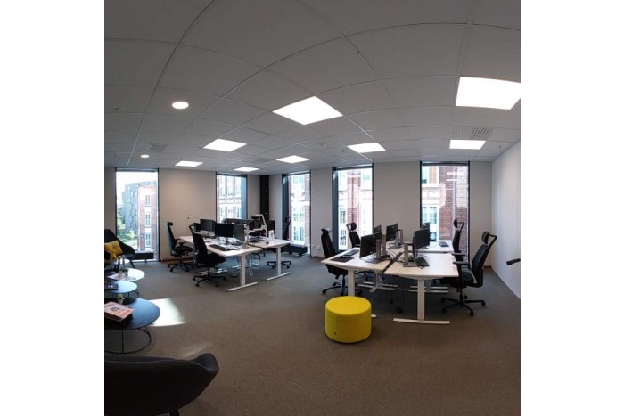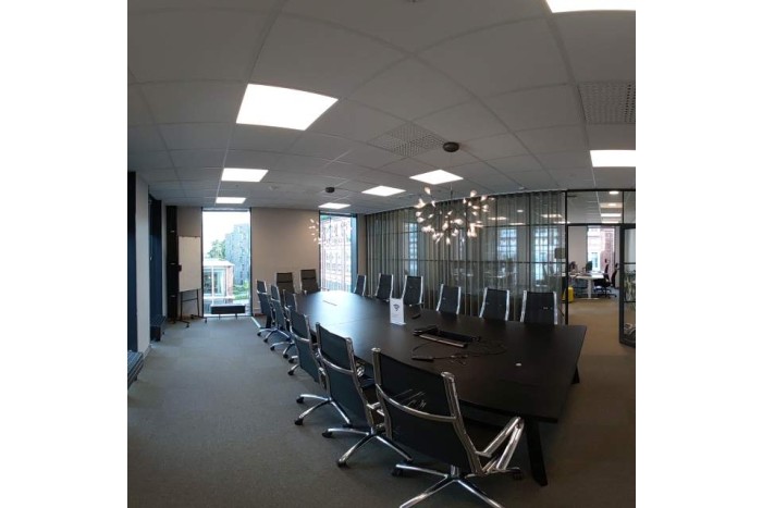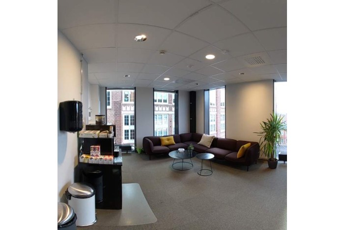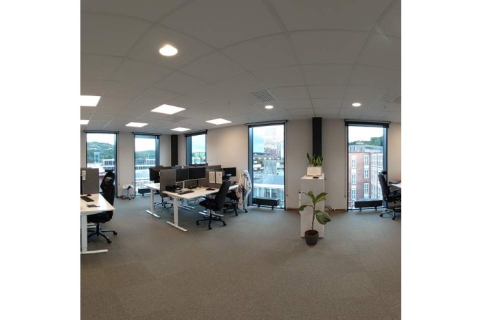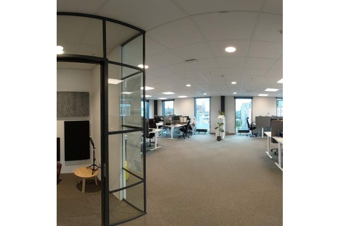 I huvudsak öppen planlösning med två mötesrum. Få en 360° rundvandring genom att klistra in länken i sökfältet på din web-läsare:
