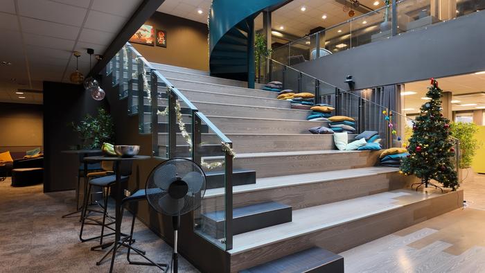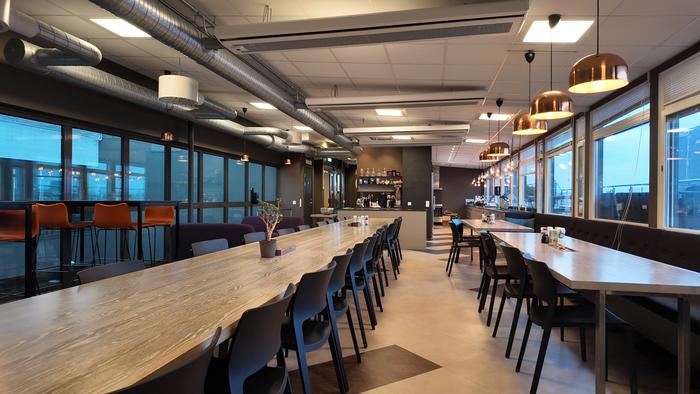 I huset finns det reception, konferensmöjligheter, gemensamt kök och terrass.