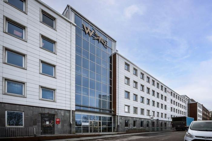 Fastighetens trapphus har två hissar vardera som tar en från underplan till översta.