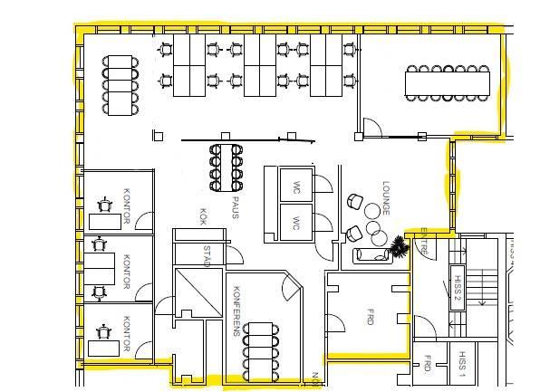Planlösning:Fint härligt kök centralt placerat i lokalen. Öppna kontorsytor samt flera kontor och projektrum. Möjlighet att installera ett par teamspoddar. Stort konferensrum. De separata kontoren kan omvandlas till mötesrum. Flexibelt kontor med fantastisk utsikt över vattnet!