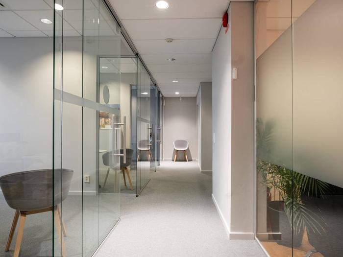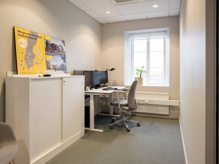 Planlösning:Fyra separata kontorsrum, samt två kontorsrum med plats för två arbetsplatser.