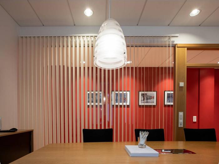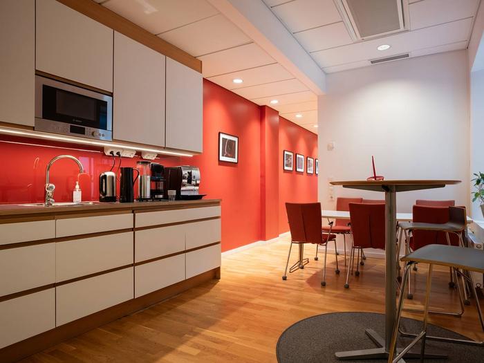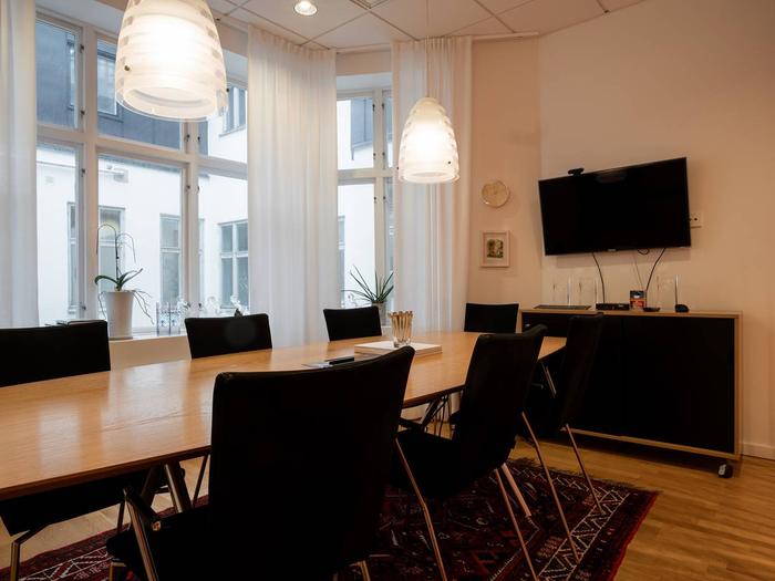 Konferensrum för 8 personer, lunchrum/kök, en WC, en HWC samt en stor entré. Två förråd finns i lokalen.