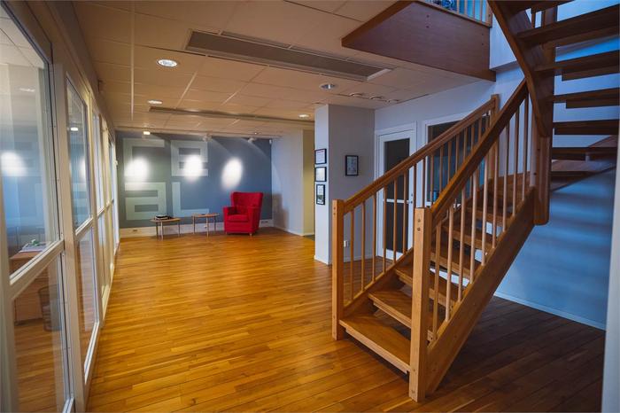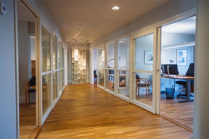 På första våningen möts du av en välkomnande loungemiljö i hallen, tillsammans med flera separata kontorsrum som ger möjlighet till fokuserat arbete.