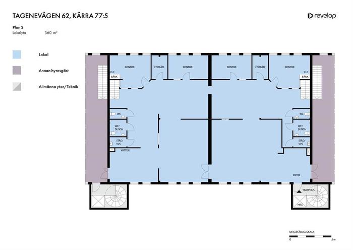 Här finns en ledig lokal på plan 2 om 360 kvm tillgänglig för er verksamhet. I entréplan finns en spiraltrappa samt hiss som tar er direkt in till lokalen. Här möts man av en öppen yta som t.ex skulle kunna vara ett showroom. Lokalen består utöver det av ett antal kontorsrum, både stora och små samt förråd och flertal WC.