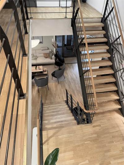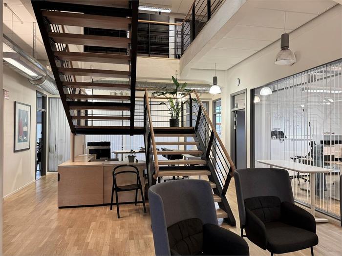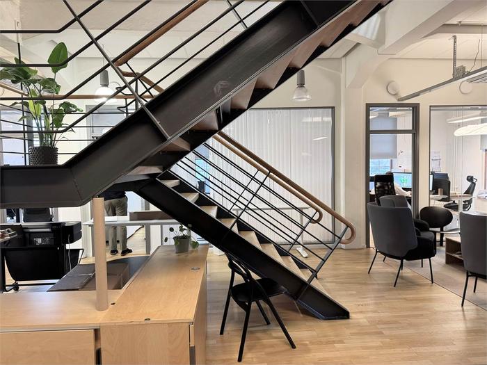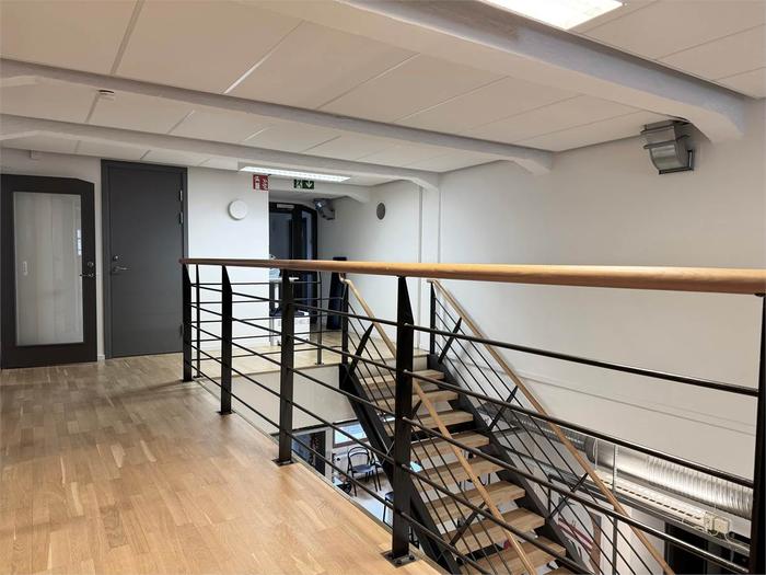 En elegant trappa leder upp till andra våningen, där tre ytterligare kontor väntar på att bli er nya arbetsplats. Här finns också ett stort mötesrum, idealiskt för att samla hela teamet eller hålla inspirerande presentationer.