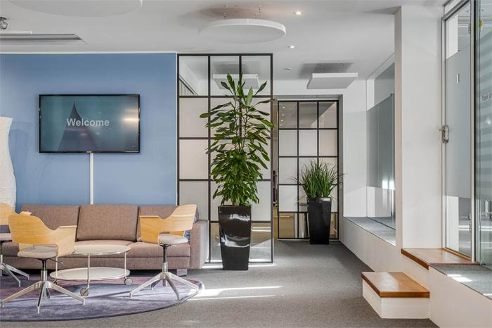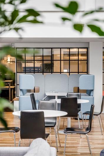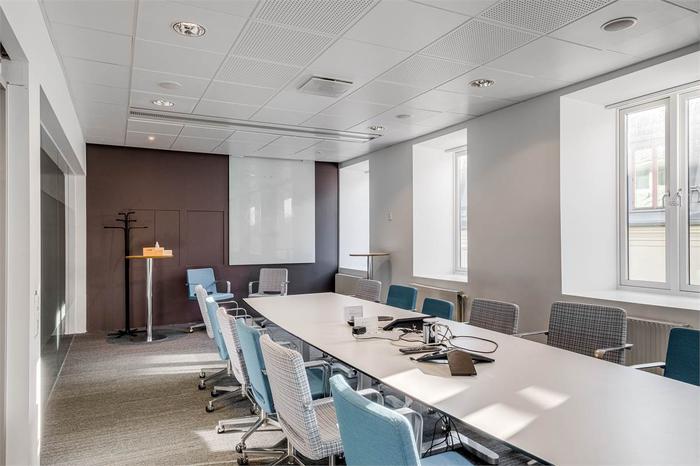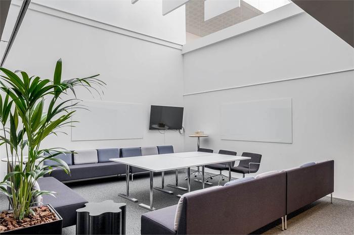 Lokalen har dessutom 17 mötesrum i olika storlekar, vilket gör det enkelt att anpassa utrymmet för såväl mindre samtal som större konferenser. Kombinationen av de öppna arbetsytorna, den centrala ljusgården och de välplanerade mötesrummen gör detta kontor till en perfekt plats för både effektivt arbete och social interaktion.