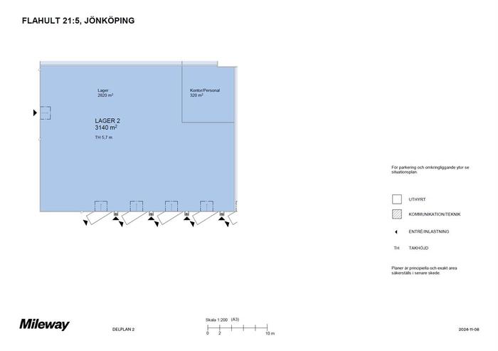 Nu finns möjlighet att hyra en välplanerad del av en modern logistik- och lagerfastighet om totalt 9 801 kvm. Den tillgängliga ytan om 3 140 kvm är särskilt anpassad för effektiv logistikhantering och erbjuder utmärkta förutsättningar för företag med höga krav på flöden, tillgänglighet och säkerhet.
