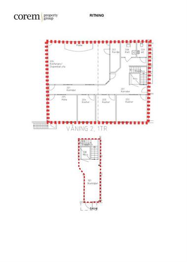 Det ljusa kontoret på andra våningen består av mindre rumsindelade kontorsrum med parkettgolv samt ett större paus- och konferensrum med tillhörande kök. Kontoret nås antingen via personhiss eller trappa.