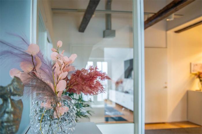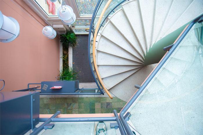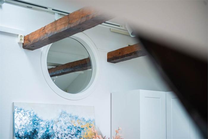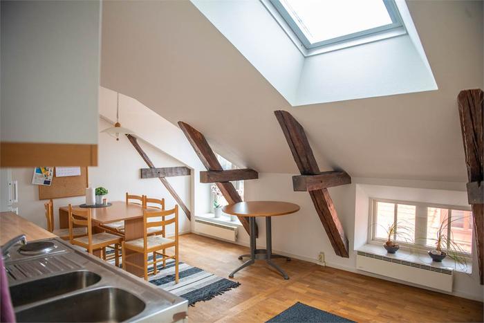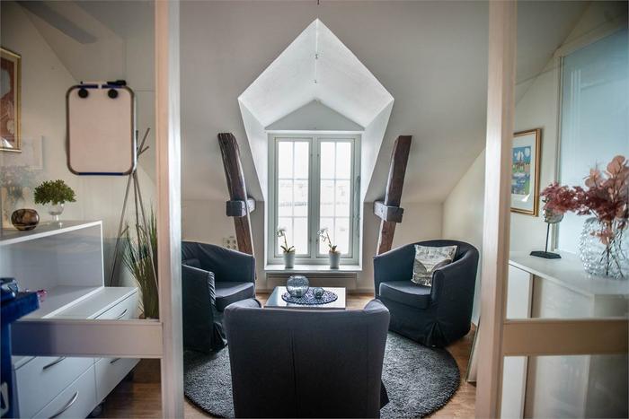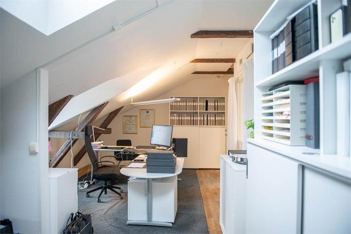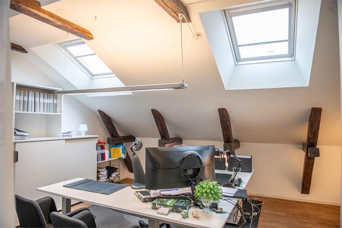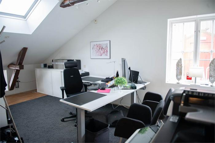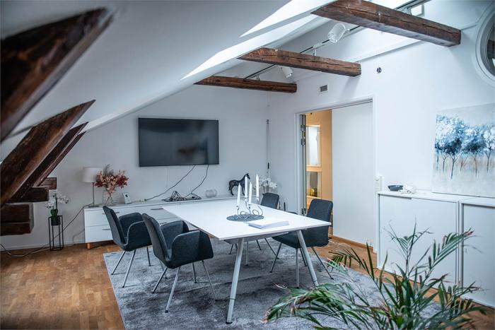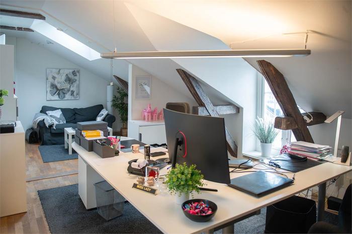 Lokalen har ett härligt ljusflöde tack vare de stora takfönstren som öppnar upp mot både stad och vatten. Takbalkarna ger en rustik känsla som ger lokalen extra karaktär. Planlösningen ger både ytor för koncentrerat arbete och plats för samarbete.
