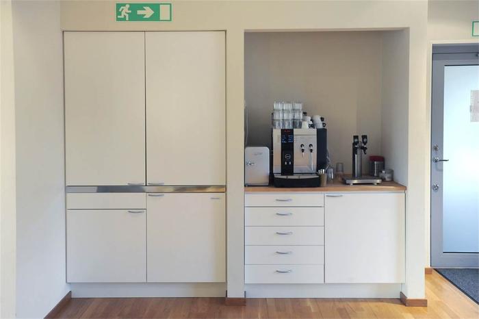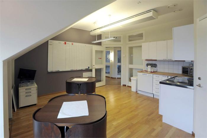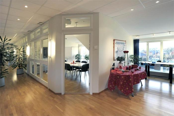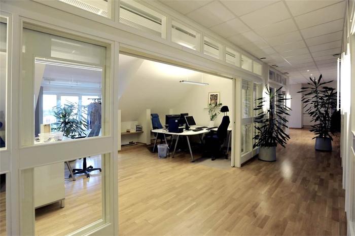 Lokalen om 210 kvm är belägen på plan 2 med hiss och har vindsvåningskaraktär med stora golvfönster som skapar generöst ljus i lokalen. Ytan har genomgående golv i ekparkett och inrymmer fem kontorsrum, ett mötesrum, personalrum/pentry samt wc. Det är en rymlig entré/hall och här finns även ett pentryt.
