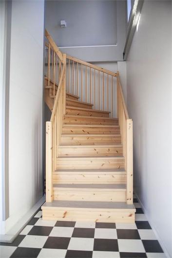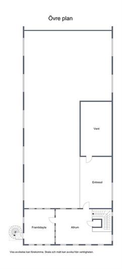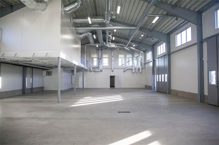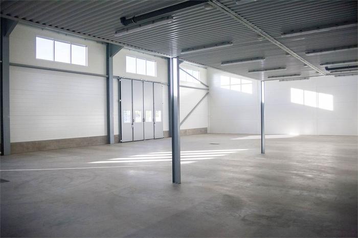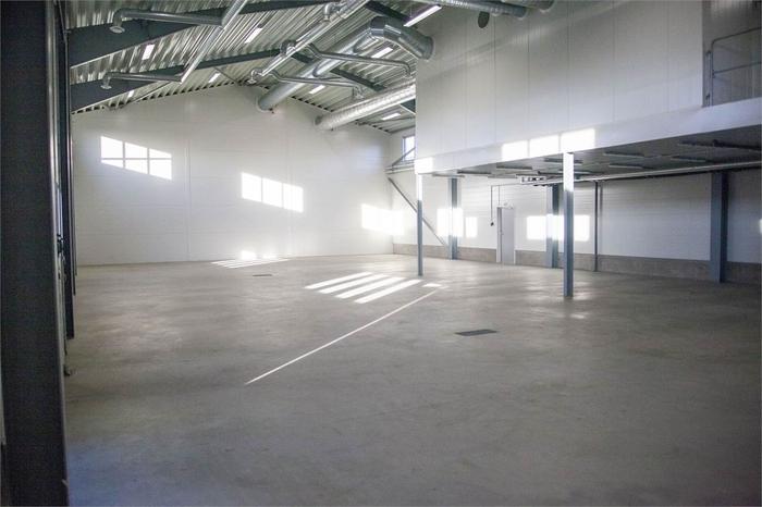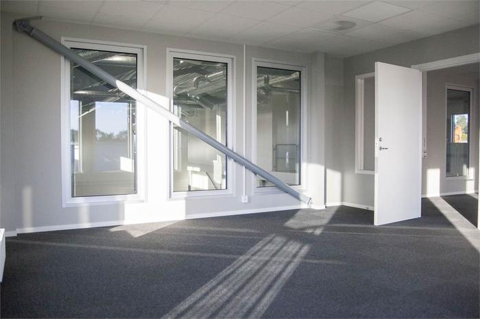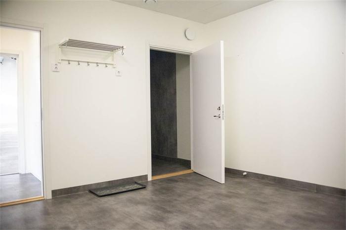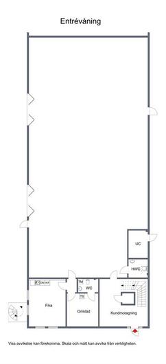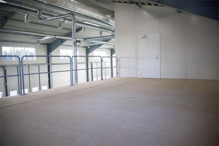 Lokalen om 641 kvm har i markplanet en stor öppen lageryta eller lättare verkstadsyta med två portar. Här finns också en entré till en kundmottagning, två toaletter och sedan ett personalutrymme med lunchrum med kök och plats för sällskapsmöbler. Från hallen går en trappa upp till övre planet med kontorsytor eller extra lager. Här finns även utgång till ett entresol med öppen yta ner till hallen.