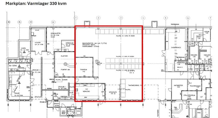 Varmlager i markplan på ca 330 kvm med motordrivenport om 4,5 meter x 3,6 meter. Takhöjd på ca 5 meter lämpligt för höglager.