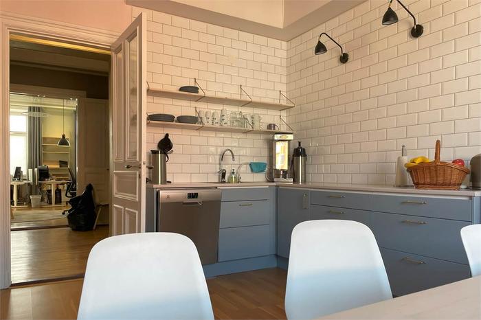 Vackert kontor med flera rum i fil, balkong och många tidstypiska detaljer bevarade såsom höga pardörrar och ett flertal kakelugnar! Personalentré och pampig kundentré. Stora rum med möjlighet till många arbetsplatser. Elegant kök med plats för många i lunchrummet. Renoverade toaletter/WC. Vackert och elegant som sagt - Välkomna!