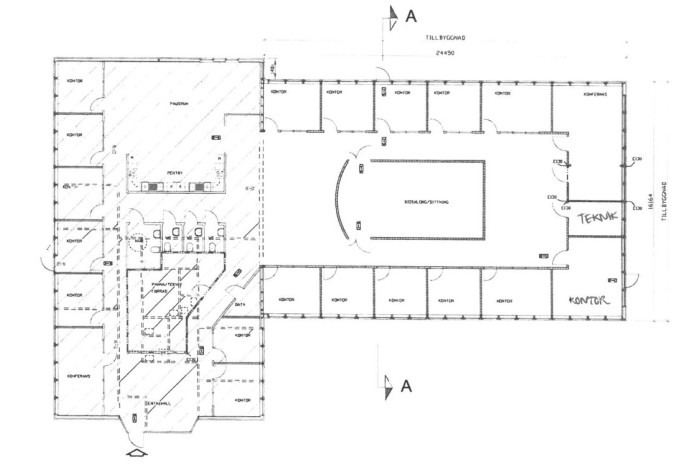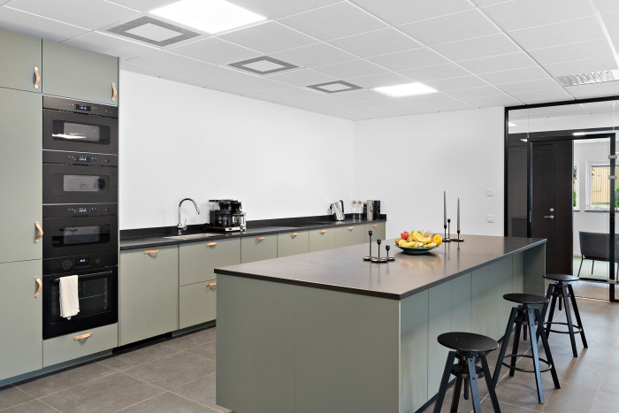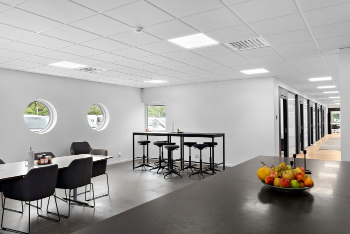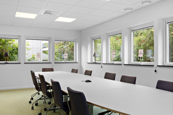 I kontorets hjärta finns ett generöst kök med matplats. Köket är utrustat med luckor i grönt, köksö, tre mikrovågsugnar, en ugn, två diskmaskiner, en spishäll, en kombinerad kyl/frys samt en fullstor kyl. Härifrån nås även den tillbyggda delen, där ett stort och modernt konferensrum i mitten erbjuder plats för större möten, workshops eller utbildningar. Intill konferensdelen finns ytterligare kontorsrum och kontorsplatser. Lokalen är ljus och trivsam, med fönsterpartier som släpper in dagsljuset. Väggarna i lokalen är vita och på golvet ligger parkettgolv/grått klinker samt grön matta i kontorsrummen och blå matta i det stora konferensrummet.