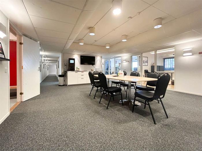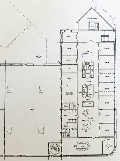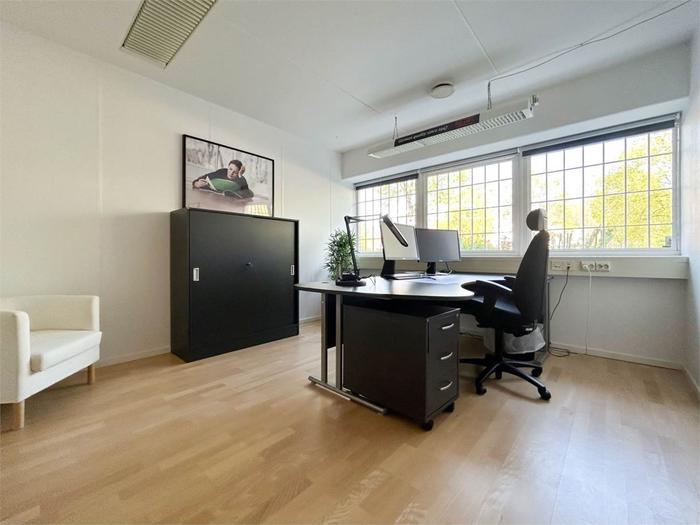 Kontor på 360 kvm bestående av entré/mottagningsdel, 9 separata kontorsrum, 2 mötesrum, pentry och en egen lagerdel på 345 kvm. Omklädningsrum med bastu finns också. Ett större mötesrum för upp till 25 personer med utgång till en egen grön uteyta.