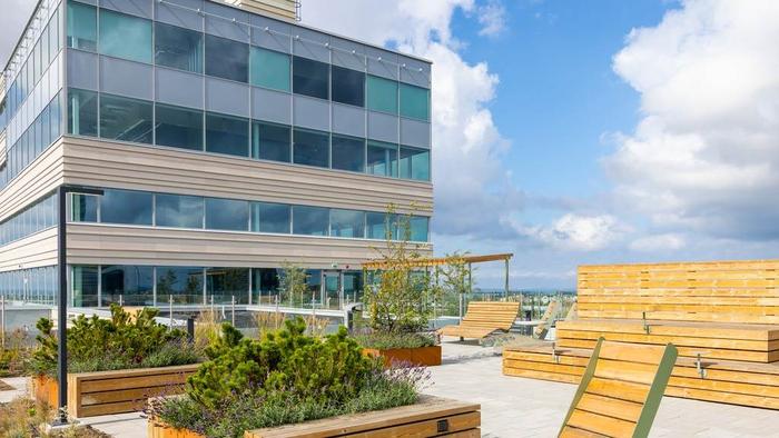 Det finns gemensamma terrasser på olika våningsplan i fastigheten. Här finns det möjlighet till såväl avkoppling som arbete.
