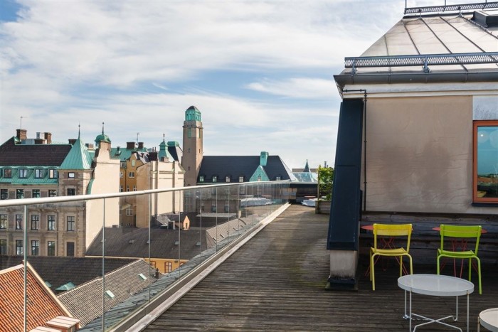 På plan 6 som är husets översta våning har ni tillgång till en egen takterass med fantastiska vyer över både öresund och stadens takåsar.