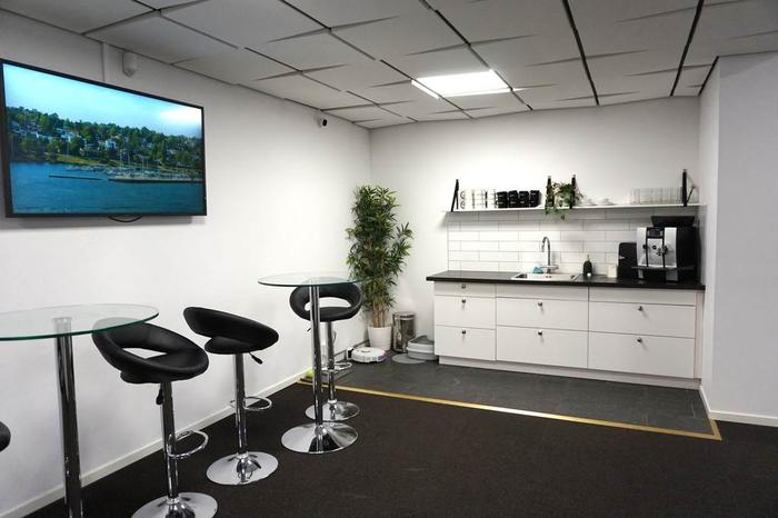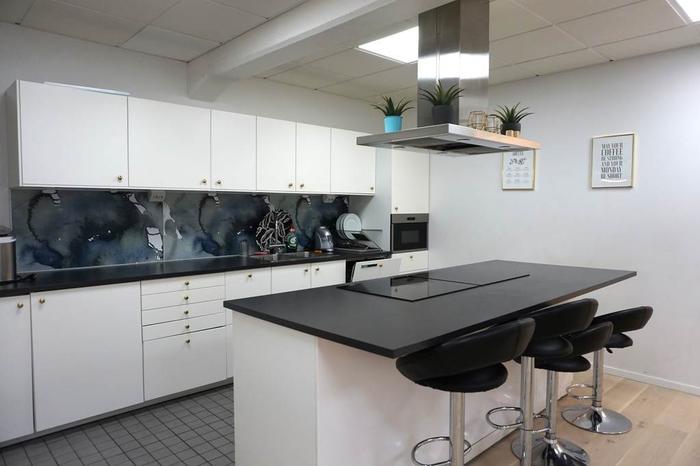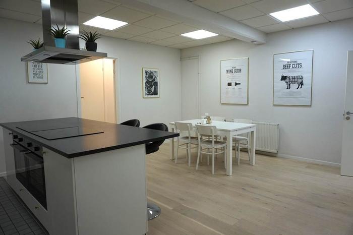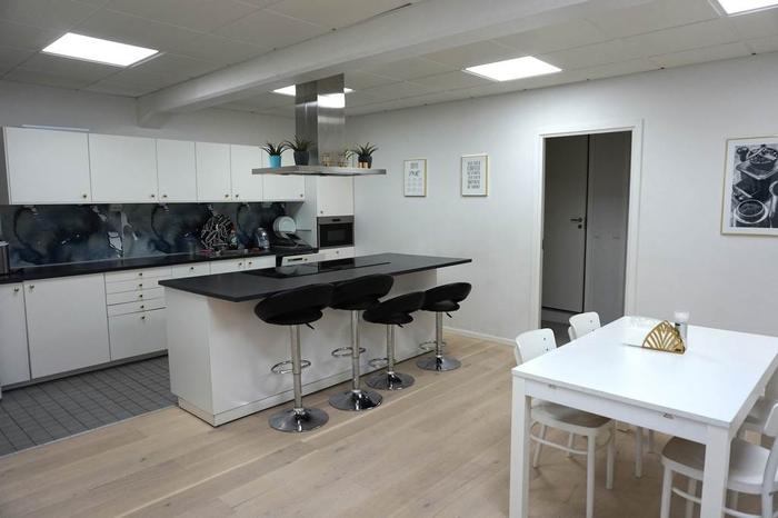 Köket är ett modernt snyggt inrett med vita köksluckor, mörk bänkskiva, köksö med dubbla spishällar och ugnar, diskho i rostfritt, diskmaskin, kylskåp. Stor plats för matbord där många anställda kan äta samtidigt. wc & dusch samt tvättstuga.