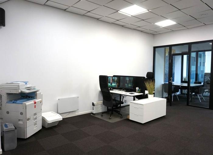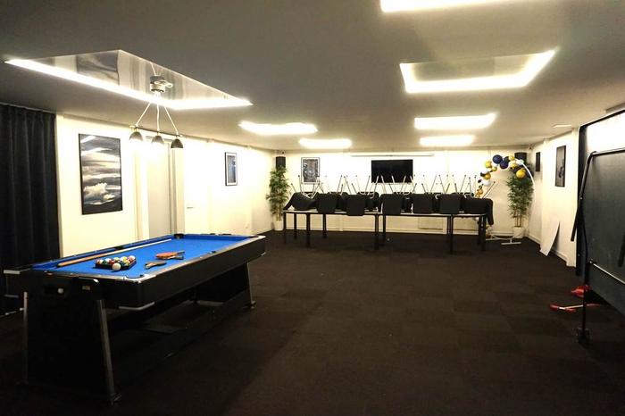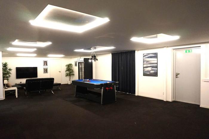 Det stora rummet är snyggt designat med en mörk filtmatta på golv, vitmålade väggar samt designade ljusarmaturer i tak. Lokalen kan med fördel kan användas till bilskoleverksamhet, showroom, lager, konferensrum, utbildningsrum, callcenter eller kontorsrum med många kontorsplatser. I anslutning till detta rum finns ett arkivrum eller förrådsrum.