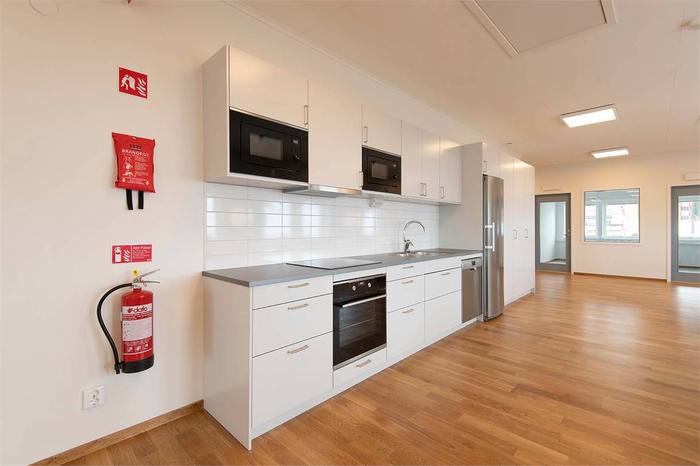 Varje halva av övervåningen innehåller 13 kontorsrum som är 9 kvm per/st samt ett konferensrum på 24 kvm. Varje lageryta på bottenvåningen är 215 kvm.