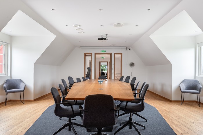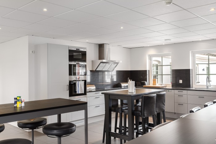 Byggnaderna binds samman genom ladan och båda delarna har på så sätt tillgång till varandra om så önskas. Köket som är beläget i kontorsdel 1 är 76 kvm och är utrustat med två mikrovågsugnar, ugn, spishäll, fläkt, diskmaskin och bänkskiva i sten – perfekt för gemensamma pauser och luncher.