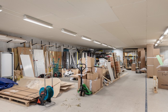 Den andra delen av byggnaden rymmer ett öppet kontorslandskap med plats för flera arbetsstationer, två separata kontor och ett konferensrum. Här finns även ett mindre kök/pentry samt två toaletter och ett duschrum.