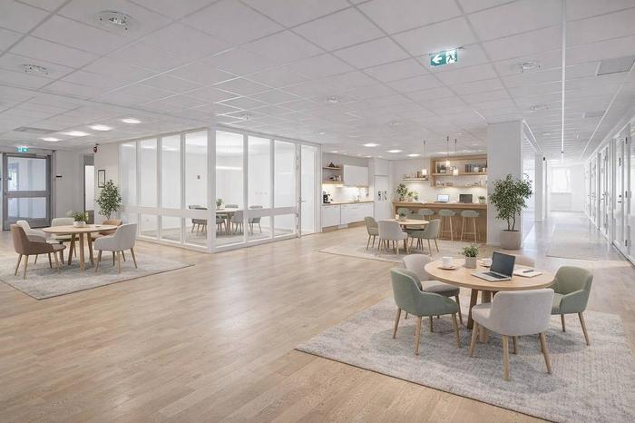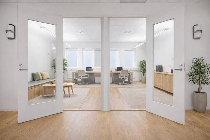 Planlösning:Genomgående stora kontorsrum, gott om mötesrum och ett väldigt stort konferensrum som går att dela av med ett vikparti.