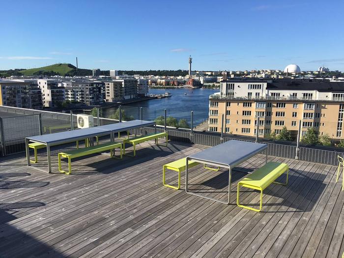 Området är mixat med bostäder, kontor och mindre servicebutiker. I anslutning till huset finns två parker med egna uteplatser. Direkt vid Norra Hammarbykajen och nära Fåfängan.